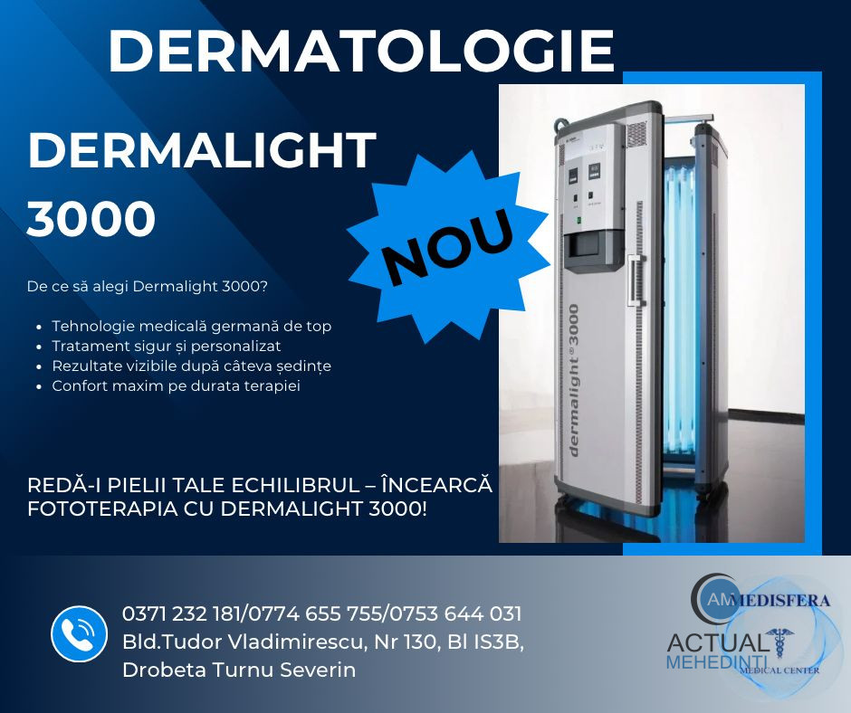 Clinica Medisfera din Mehedinți a început să ofere pacienților săi tratamente inovatoare prin introducerea echipamentului dermatologic DERMALIGHT 3000. Acest dispozitiv folosește fototerapia cu UVA și UVB narrow-band (311 nm), fiind primul de acest fel din județ. Potrivit actualmehedinti.ro, acest tip de tratament este eficient, non-invaziv și considerat sigur.
