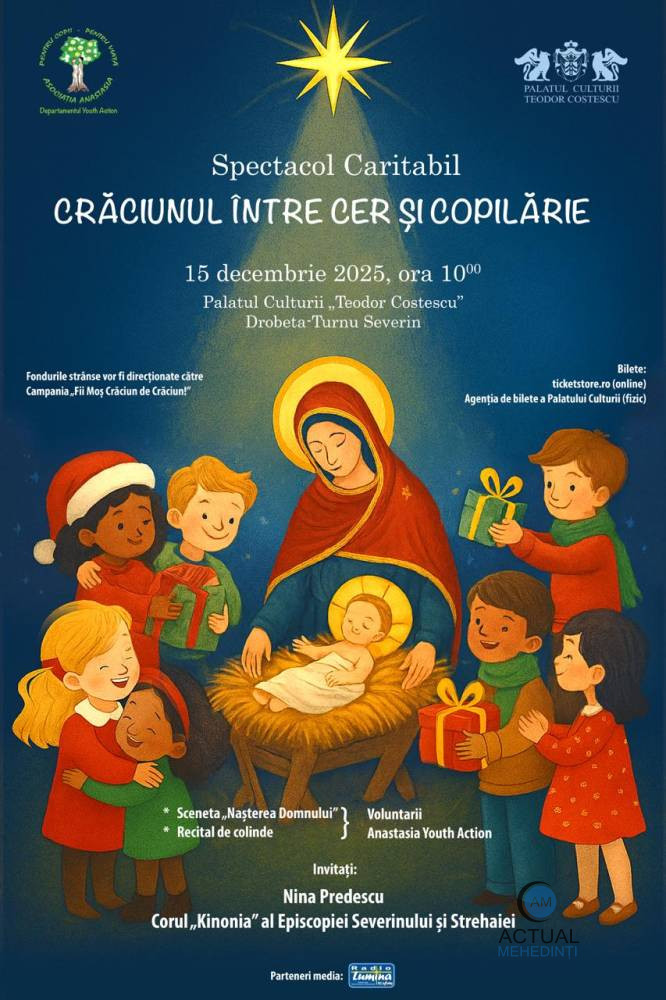 Pe 15 decembrie 2025, începând cu ora 10:00, Asociația Anastasia invită publicul la spectacolul caritabil „Crăciunul între Cer și Copilărie”, care va avea loc în sala mare a Palatului Culturii „Teodor Costescu” din Drobeta-Turnu Severin. Evenimentul este dedicat tradiției, speranței și generozității.